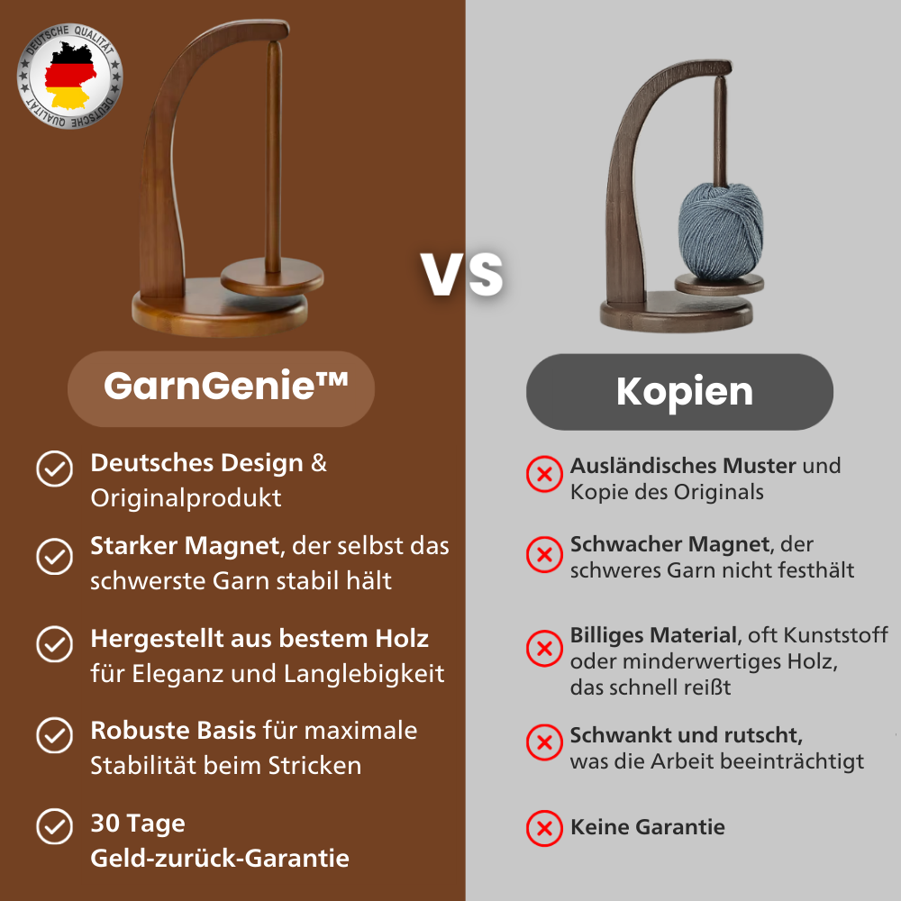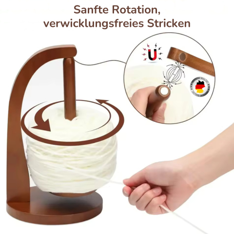 GarnGenie™ ist eine robuste und langlebige Lösung aus strapazierfähigem Holz mit einem starken Magneten, der das Garn an Ort und Stelle hält, alle Arten von Garn handhabt und es Ihnen ermöglicht, ungehindert zu stricken, ohne Verwicklungen oder Unterbrechungen!