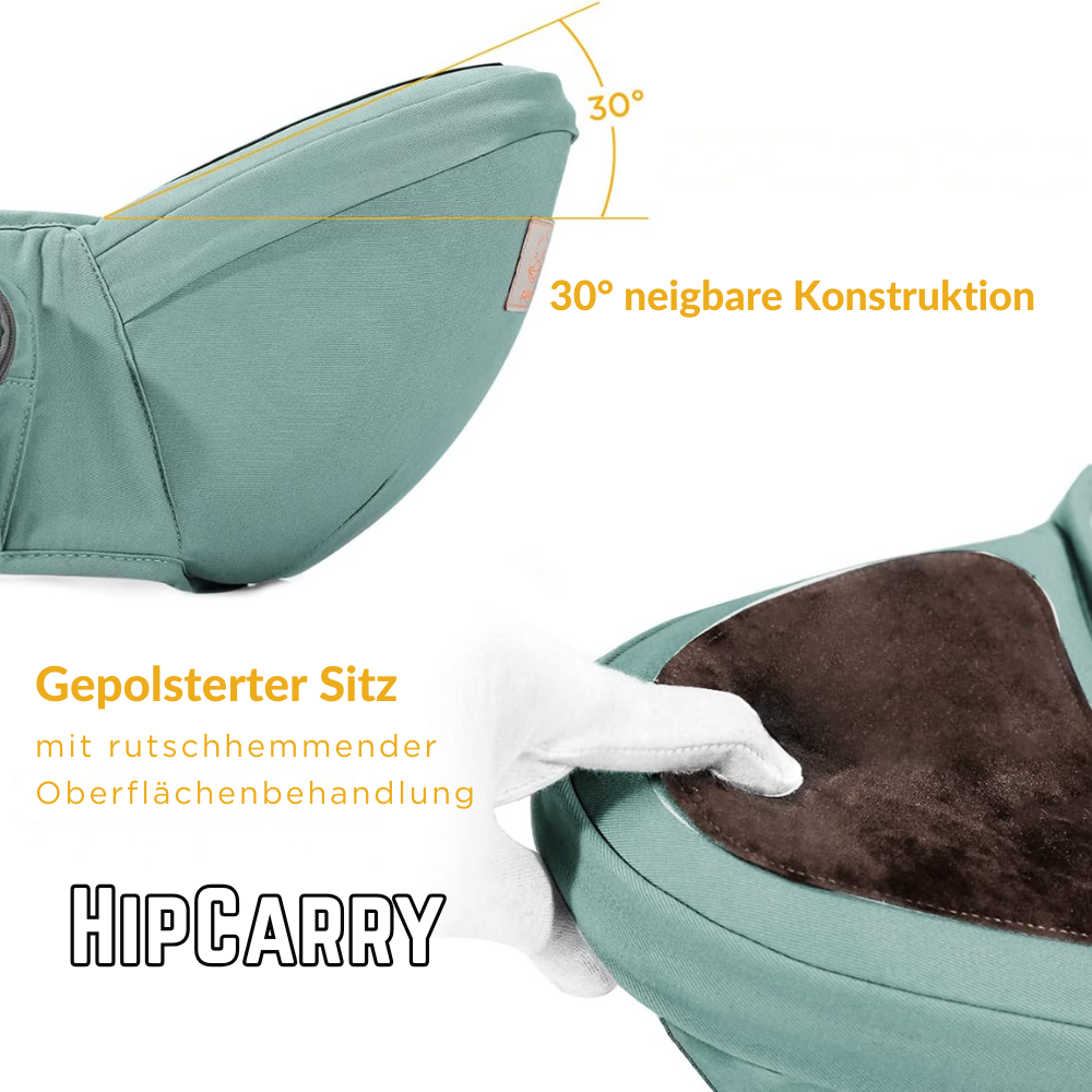 HipCarry™ ist ein ergonomischer Hüfttragesitz, der speziell entwickelt wurde, um die Hüften der Eltern zu entlasten, während sie ihr Baby tragen. Das Produkt besteht aus einem Sitz, in dem das Baby sitzen kann, und einem Hüftgurt, der um die Taille des Elternteils befestigt wird. Der Hüftgurt ist verstellbar und kann an verschiedene Taillengrößen angepasst werden. Der Sitz ist so konzipiert, dass er die natürliche Beckenposition des Babys unterstützt und den Druck auf den Rücken der Eltern reduziert.