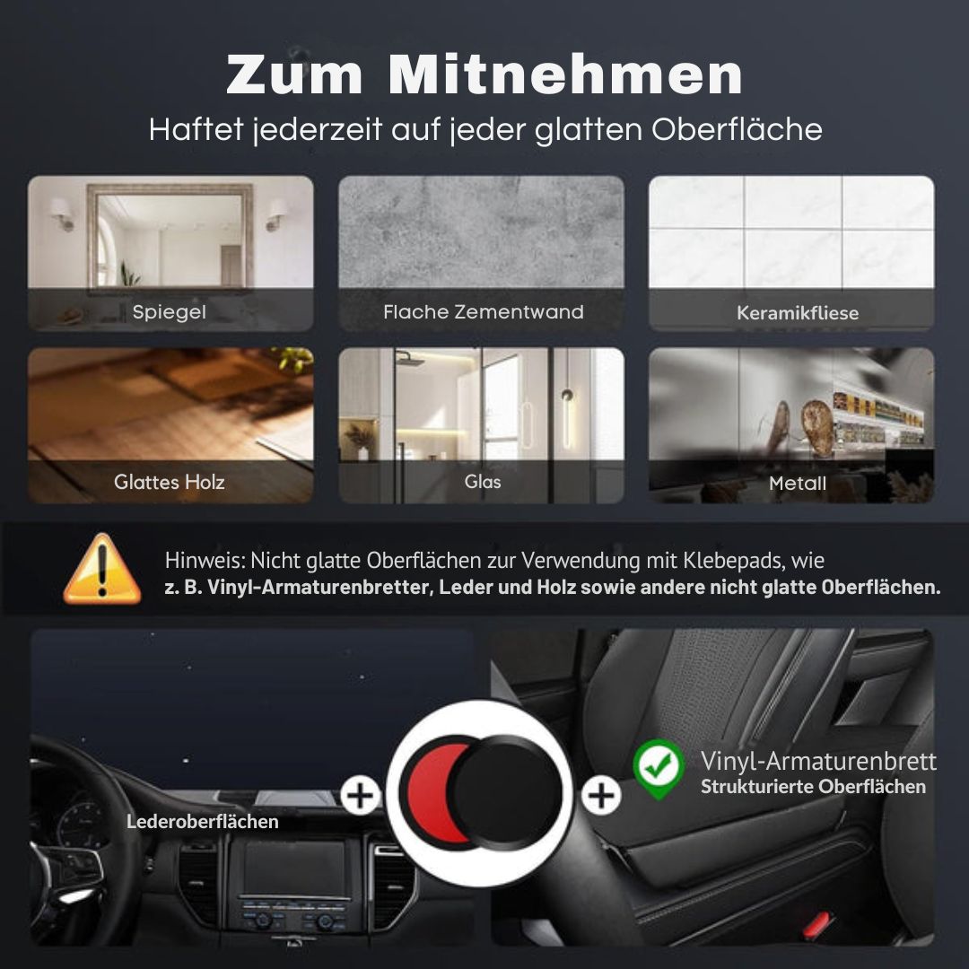 Verwenden Sie das glänzende Basis-Pad, das im Lieferumfang enthalten ist, oder montieren Sie es auf Glas und flachen Oberflächen für den besten Halt.