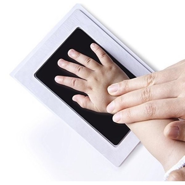 📸 Ein gerahmtes Foto deines neugeborenen Kindes - mit seinem oder ihrem ersten Handabdruck daneben.