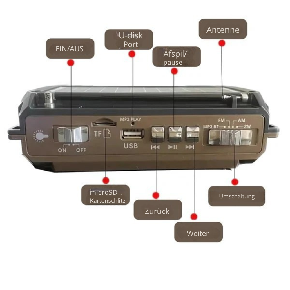 - Auflade-Optionen: Handkurbel, Solarpanel, USB
