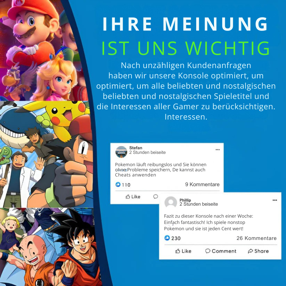 Über 10.000 vorinstallierte Spiele von mehr als 28 Konsolen bieten Ihnen eine riesige Auswahl an Retro-Klassikern und den neuesten Hits. Von Super Mario über Pokémon bis hin zu GTA bietet unsere Spielekonsole fast jedes Spiel, das du dir wünschen kannst.